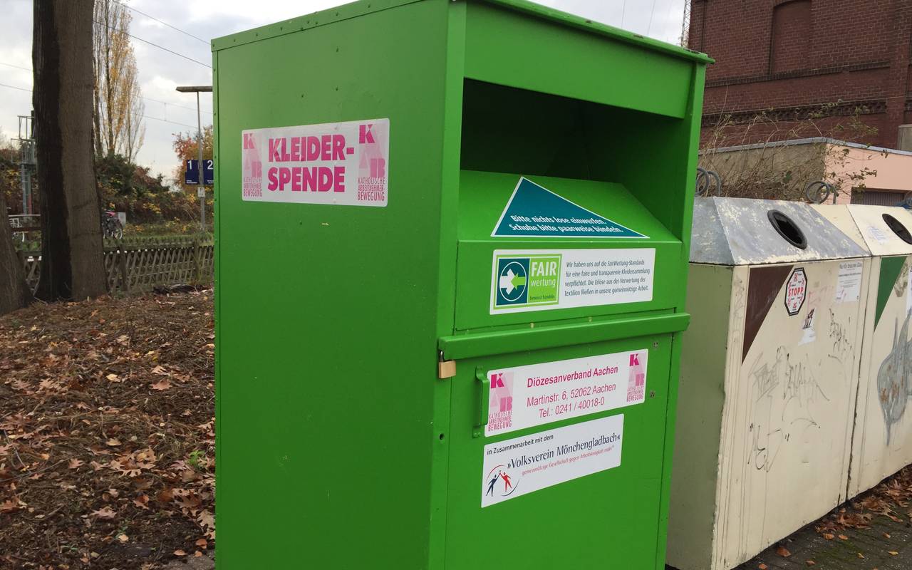- Der Volksverein Mönchengladbach sammelt nicht nur Kleidung, sondern bietet über die Erträge Arbeitsplätze für langzeitarbeitslose Menschen. Die Container werden täglich kontrolliert, geleert und gereinigt. Alle drei Organisationen sind Mitglied im Dachverband FairWertung, der sich für transparente, gemeinnützige Altkleidersammlungen einsetzt.