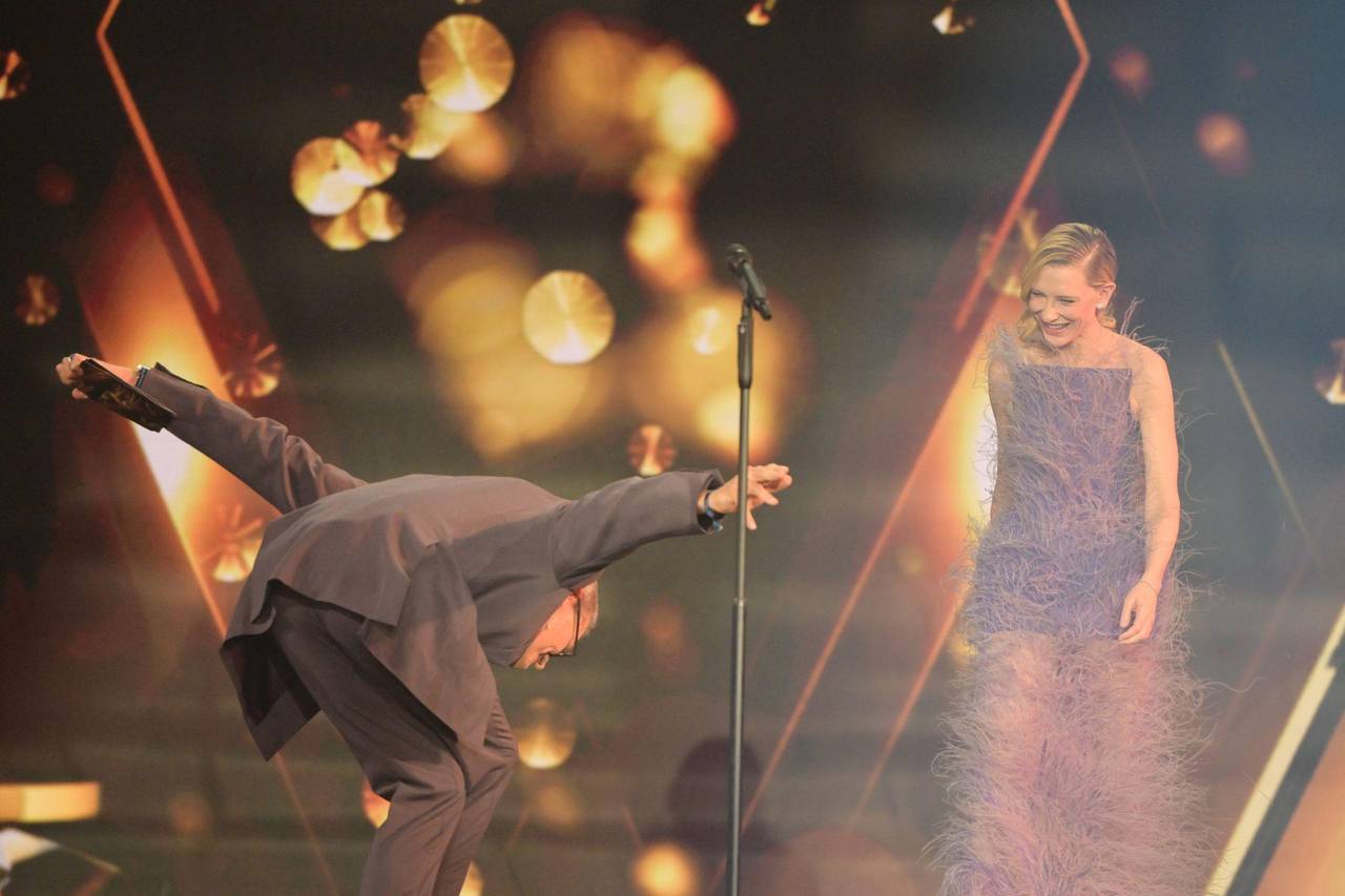 Laudator Götz Otto verneigt sich von Cate Blanchett.© Peter Kneffel/dpa