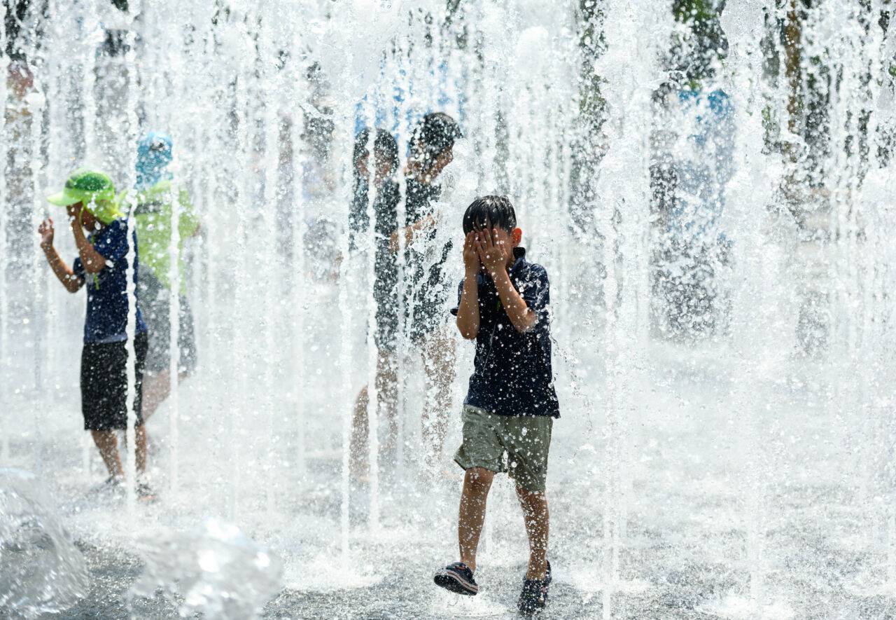 Kinder kühlen sich in einem Brunnen nahe des Rheins ab.