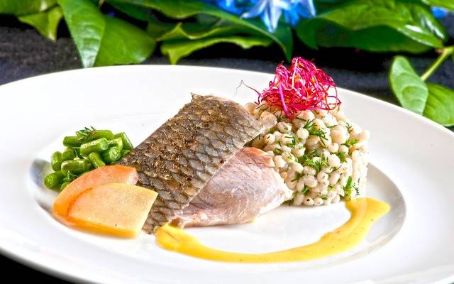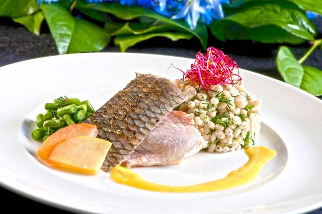 Frühlingshaftes Fischfilet mit Safran-Reduktion, Spargel-Erdbeer-Gemüse und einem Risotto von Graupen und frischen Kräutern