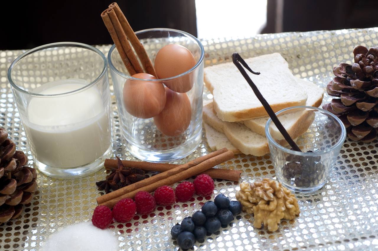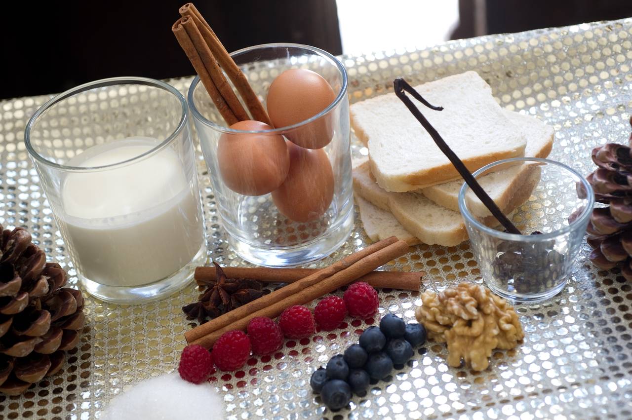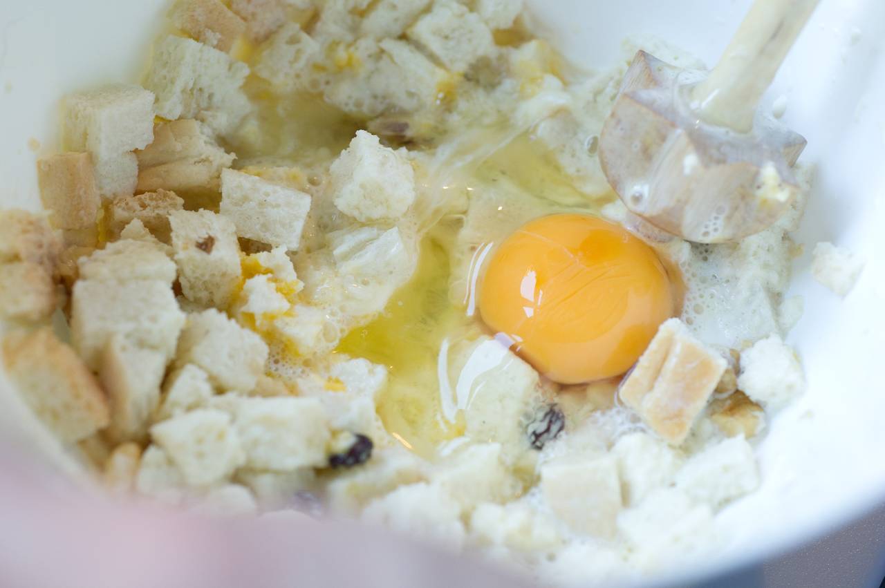 Toastbrotwürfel mit Rosinen und gehackten Walnüssen mischen und dann die Milch-