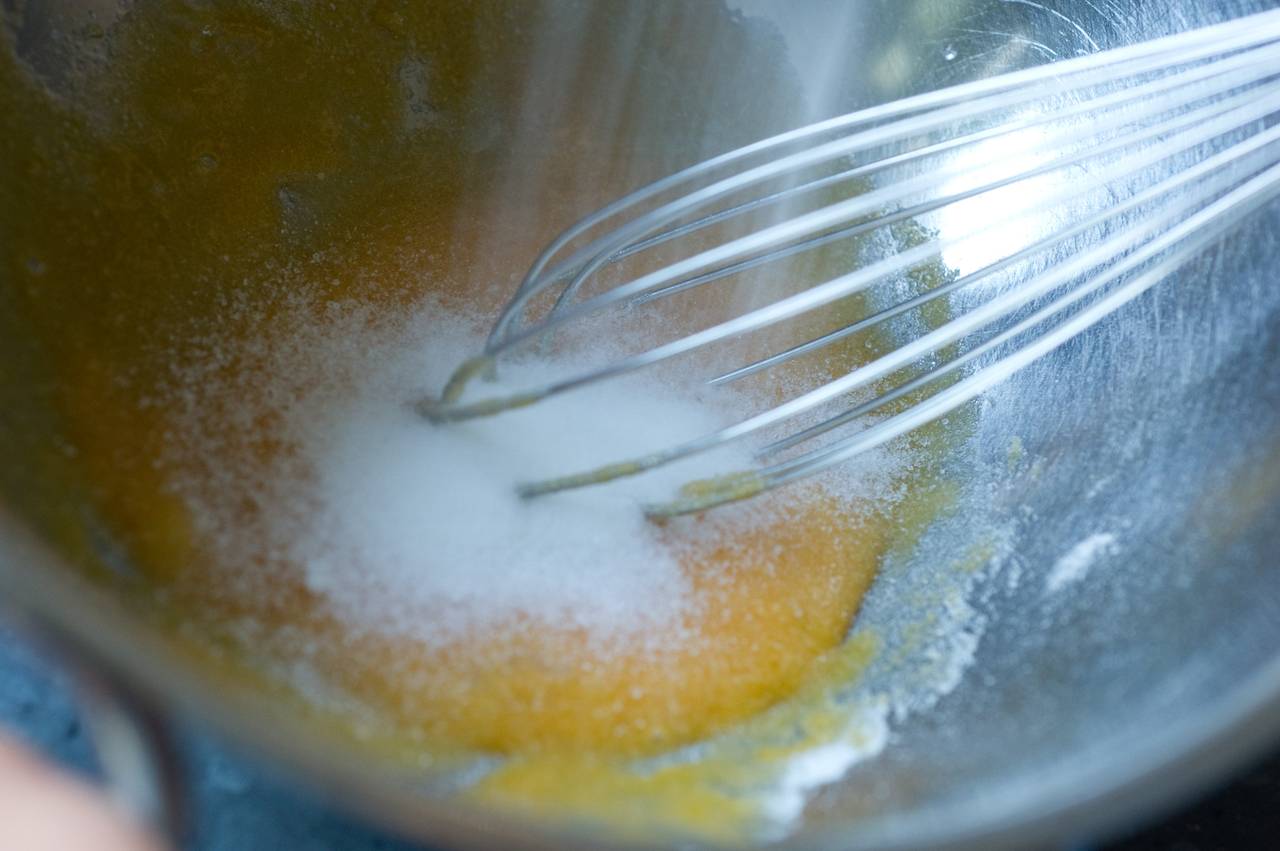 Sahne darüber geben und 20 Minuten ziehen lassen, an und an umrühren. Eigelb dazu