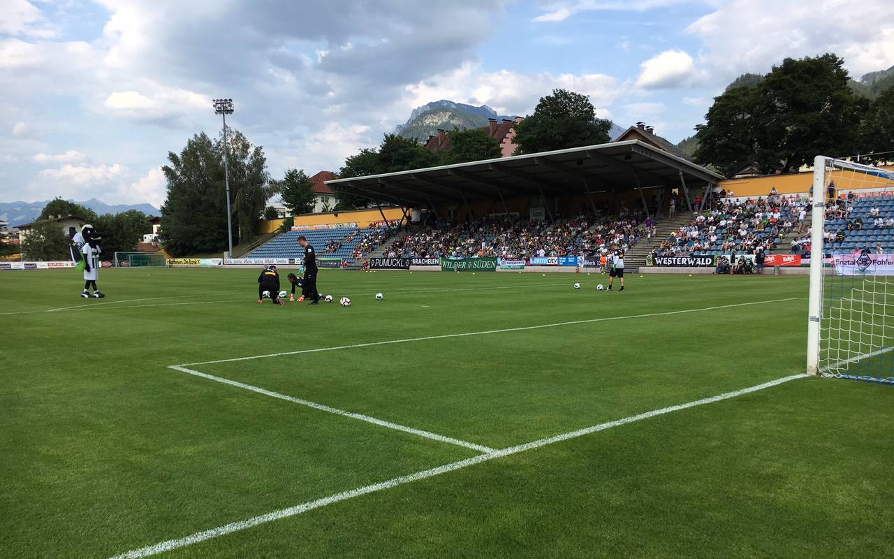 Minute 3: Die große Haupttribüne der Kufsteiner Arena ist zu etwa drei Vierteln gefüllt. Bestimmt 300-400 Gladbacher Fans geben den Ton an.