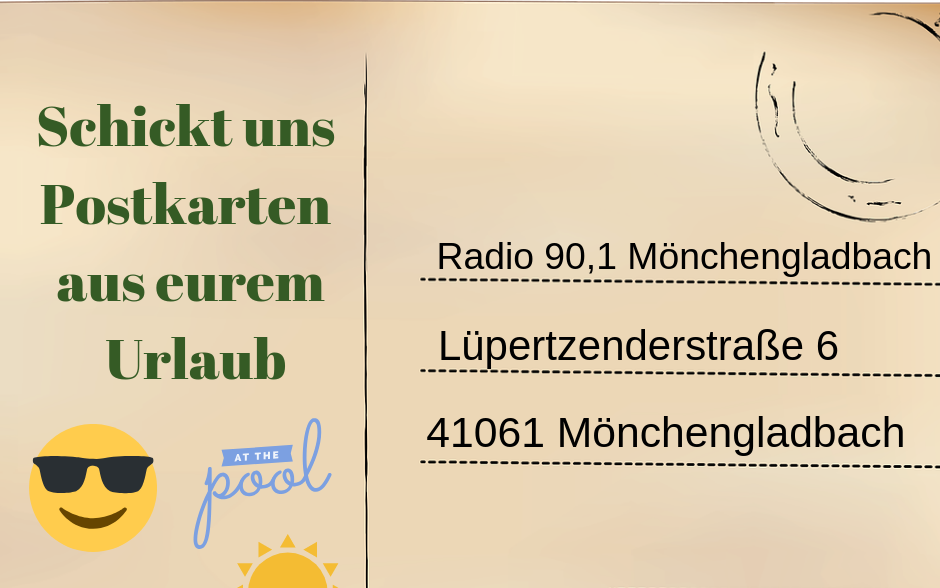 Schickt uns Eure Postkarten aus dem Urlaub oder aus Mönchengladbach. Wir haben für die schönsten und coolsten Postkarten tolle Gewinne. Lasst Euch überraschen! Unsere Adresse: RADIO 90,1 Mönchengladbach, Lüpertzender Straße 6, 41061 Mönchengladbach.