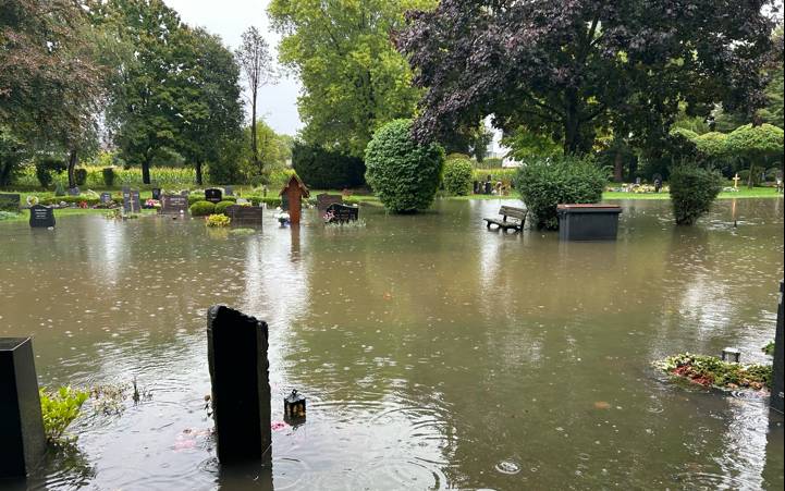 Viele Schäden werden laut Mags erst jetzt nach und nach sichtbar. Geropark, Bresgespark und Beller Park wurden überschwemmt, und im Schlosspark Wickrath seien die gerade erst neu angelegten Wege komplett weggeschwemmt worden. Auf den Friedhöfen Ohler und Rheydt sind Gräber durch das Hochwasser abgesackt und auf dem Friedhof Wickrath wurde der Grabschmuck weggespült. Auch die Kehrmaschinen der GEM waren am Dienstag im Dauereinsatz, um Straßen von Schlamm zu befreien. Auf der gesperrten Friedensstraße konnte die GEM die Mülltonnen nicht leeren, das wird heute nachgeholt.