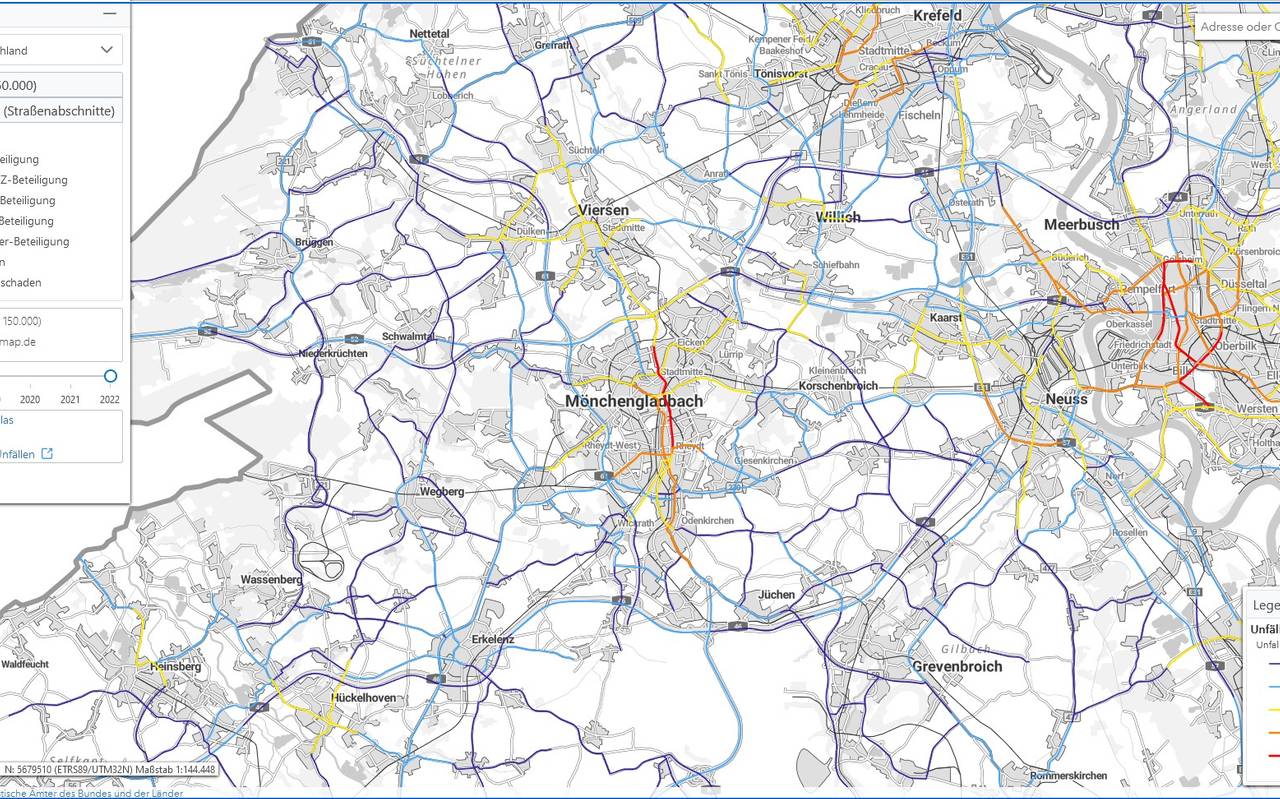 In Mönchengladbach sind im letzten Jahr sieben Menschen nach Verkehrsunfällen gestorben. Das zeigen Zahlen der Polizei und auch der aktuelle Unfallatlas der Landesstatistiker. Der Atlas erfasst nicht nur, welche Unfälle in der Stadt passieren, sondern auch wo. Tödliche Unfälle gab es im vergangenen Jahr über das ganze Stadtgebiet verteilt, meistens aber Abseits der Hauptverkehrsstraßen. Der Atlas zeigt neben den individuellen Unfällen aber auch, wo sich Unfälle besonders häufen. Dabei kann auch nach Art der Verkehrsmittel sortiert werden. Für Mönchenlgadbach zeigt sich, dass Autofahrer die meisten Unfälle auf den vielbefahrenen Routen zwischen Rheydt und Mönchengladbach haben. Hier geraten sie besonders häufig auch an Fußgänger und Radfahrer, die den größten Teil ihrer Unfälle auf den beiden Routen haben. Der Atlas steht allen im internet zu Verfügung und kann kostenlos genutzt werden. Den Unfallatlas findet ihr hier.